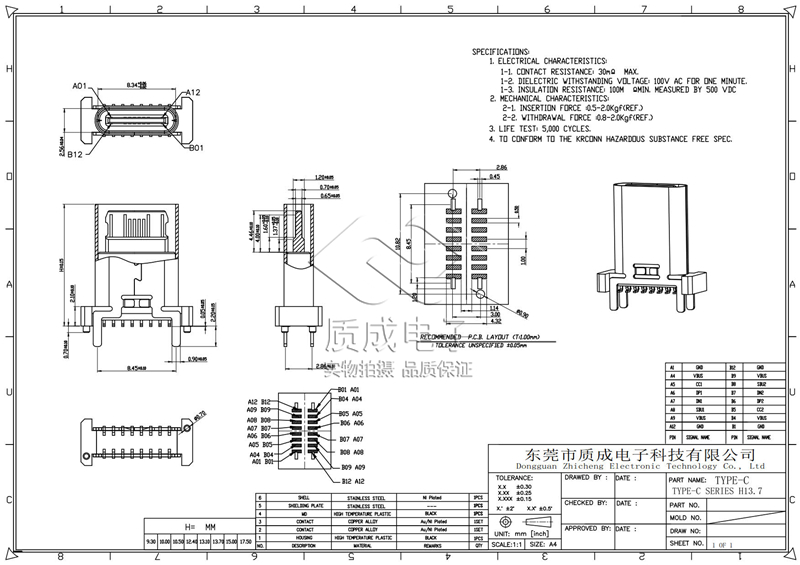 TYPE-C母座接口16PIN沉板1.6鍍金1U 充電母座USB連接器
