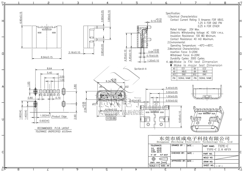 TYPE-C連接器2.0全插6PIN快速充電母座5A不銹鋼
