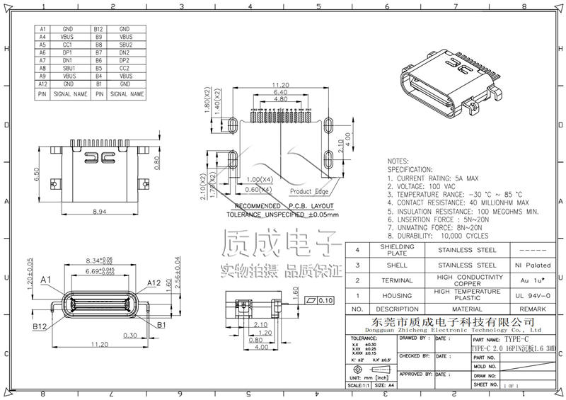 • 型號:TYPE-C 2.0 16PIN沉板1.6 3MD